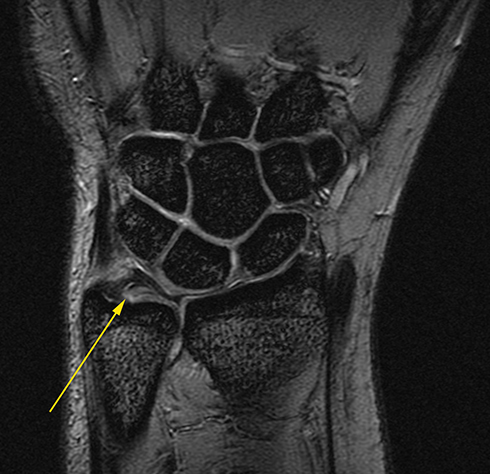 Damage to the triangular fibrocartilage that separates the wrist bones from the ulna in the forearm is indicated by the yellow arrow.